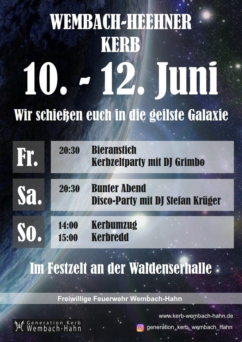 Kerb-Freitag und Kerb-Samstag feiern wir mit Euch bei uns im Kerbzelt. Sonntags laden wir euch morgens zu unserem Gottesdienst im Kerbzelt sowie zu unserem Kerbumzug mit anschließender Kerbredd ein. Solltet ihr noch keine Einladung zum Kerbumzug erhalten haben, könnt ihr euch gerne unter info@kerb-wembach-hahn.de melden.